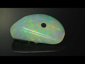 One 19.30 carats cabochon Welo Opal, rainbow color, cut grade very good, measuring 18 mm wide, 35 mm long. A unique opal for the designer in you. The hole was where the parent rock ran through the opal and you can see a little left in the hole which should cover with either a metal bar through the hole or possible a gem bezeled in the hole.
