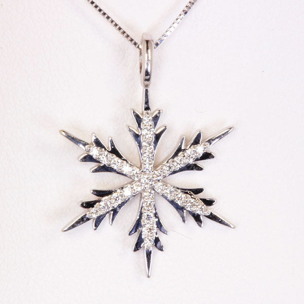 14k white gold diamond snowflake pendant, with thirty-one F color, SI1 clarity, ideal round brilliant cut diamonds. The diamonds weigh .19 carat.. The pendant weighs 2.49 grams. Our register #1ldp1136. MADE TO ORDER, PLEASE ALLOW 2 WEEKS FOR PRODUCTION.