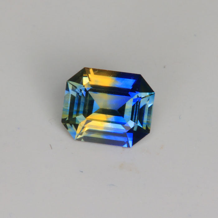 One .93 carat emerald cut sapphire from Madagascar, bicolor (yellow/blue) color, VS1 clarity, cut grade excellent, measuring 5 mm wide, 6.1 mm long, 3.2 mm deep; with excellent polish and excellent symmetry. Sapphire is heated to enhance color.