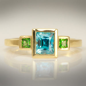 18K Yellow Gold Emerald Cut Blue Zircon and Tsavorite Garnet Ring