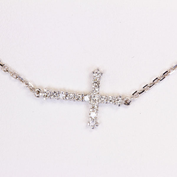 14 karat white gold cross with sixteen near colorless eye clean diamonds with excellent brilliance. Diamonds weigh .25 carats, H color, SI2 clarity. Durable cable link chain with secure lobster clasp.