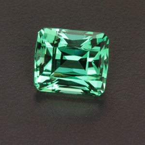 One 9.60 carats emerald cut tourmaline from the Democratic Republic of Congo, bluish green color, VVS clarity, cut grade excellent, measuring 10.7 mm wide, 12.4 mm long, 9.2 mm deep; with excellent polish and excellent symmetry. The proportions of the tourmaline are as follows: total depth 86%, table width 53.3%. Likely natural untreated color. Cut by Steve Moriarty..