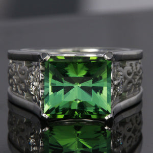 14K White Gold Barion Style Emerald Cut Green Tourmaline Ring