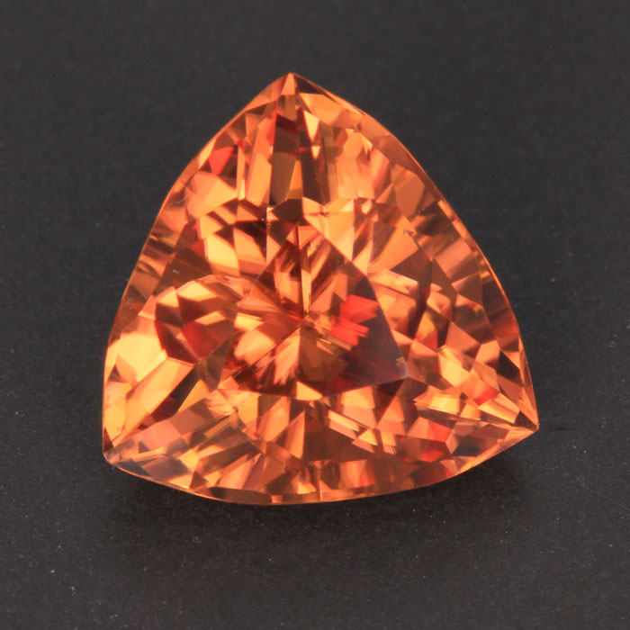One 7.58 carats trilliant cut imperial zircon, peach color, VS1 clarity, cut grade excellent, measuring 11.8 mm wide, 12 mm long, 6.7 mm deep; with excellent polish and excellent symmetry. The proportions of the imperial zircon are as follows: total depth 56.3%, table width 43.7%. The overall quality rating of this imperial zircon is 973 out of 1000.  Imperial zircon is color enhanced by heating to lighten color