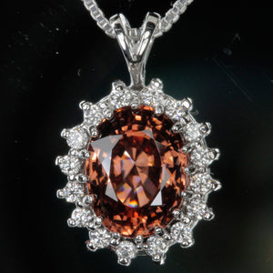 Ladies' 14k white gold imperial zircon pendant, with one oval imperial zircon from Tanzania measuring 9.5 mm wide, 12.5 mm long, and 6.4 mm deep, weighing 8.08 carats. The zircon is set in a 14k white gold 6 prongs cast in mtg. Zircon has been enhance by heating. In addition, there are sixteen prong set round brilliant cut diamonds, F-G color, SI1-VS2 clarity, with a total weight of .43 carat. The pendant weighs 4.62 grams. Our register #4zi1085