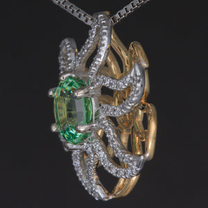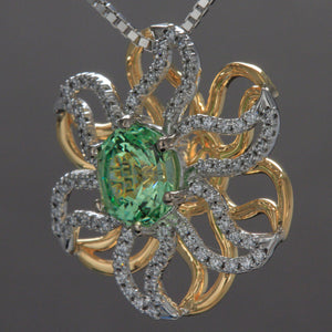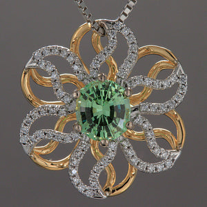 Ladies' 18k yellow and white gold merilani mint garnet pendant, with one 3.00 carats stepped oval Merilani Mint Garnet, slightly blue green color, VVS clarity, cut grade excellent, measuring 8.1 mm wide, 9.1 mm long, 5.6 mm deep. The proportions of the Merilani Mint Garnet are as follows: total depth 69.1%. From the Tanzanite mines in Merilani Tanzania. The merilani mint garnet is 6 prong set. In addition, there are seventy-eight prong set ideal round brilliant cut diamonds, F-G color, VS-SI1 clarity, measuring 1.2 mm wide by 1.2 mm long with a total weight of .60 carat. The pendant weighs 8.8 grams.