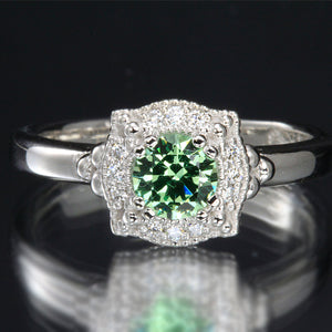Ladies' 14k white gold Merilani Mint Garnet ring designed by Christopher Michael, with one mint green color, VS clarity, round brilliant cut Merilani Mint Garnet. The Merilani Mint Garnet weighs 0.66 carat, measures 5.4 mm wide by 5.4 mm long by 3.3 mm deep, and is prong set. In addition, there are twelve prong set round brilliant cut diamonds, D-E-F color, VS1 clarity, with a total weight of 0.10 carat. The ring weighs 5.3 grams. Our register #4ga1106.