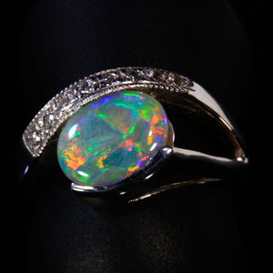 Ladies' 14k white gold opal ring, with one oval cabochon cut opal from Australia, weighing 1.68 carats. Opal is set in a 14k white gold channel setting. In addition, there are eight prong set round brilliant cut diamonds, F color, VS2-SI1 clarity, with a total weight of .12 carat. The ring weighs a total of 5.10 grams Darker base color of this opal will sometimes be categorized as semi-black