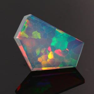 One 7.53 carats faceted pentagonal shape opal, cut grade very good, measuring 15.4 mm wide, 21 mm long, 6.3 mm deep; with excellent polish and excellent symmetry. Honeycomb pattern. Faceted by Steve Moriarty