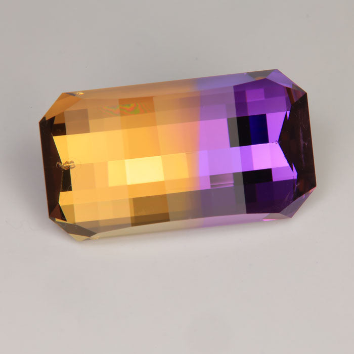 One 25.58 carats Opposed bar (pixel cut) ametrine, yellow/purple color, VS2 clarity, cut grade excellent, measuring 12.8 mm wide, 23.3 mm long, 12.4 mm deep; with excellent polish and excellent symmetry. Natural untreated color. Cut by Steve Moriarty.