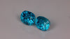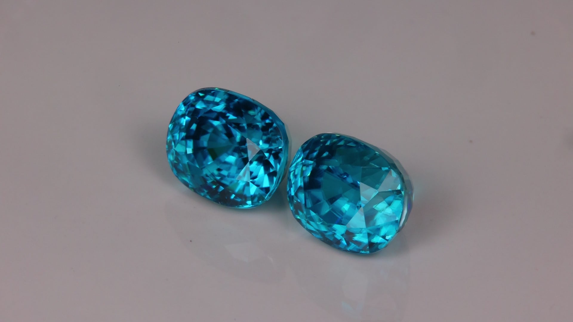 One matched pair 15.37 carats antique cushion blue zircon from Cambodia, greenish blue color, VS1-VS2 clarity, cut grade good to very good, measuring 8.5 mm wide, 10.5 mm long; with very good polish and good to very good symmetry. Zircons are heated to enhance their color.