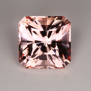 One 33.00 carats square barion Morganite from Ethiopia, peach color, VS clarity, cut grade excellent, measuring 18.5 mm wide, 18.5 mm long, 15 mm deep; with excellent polish and excellent symmetry. The proportions of the Morganite are as follows: total depth 81%, table width 45.4%. The Morganite also has a crown angles of 50°-40°-30°and a pavilion angle of 42°. This morganite has natural untreated color and was cut by Steve Moriarty. Long exposure to daylight may cause this color to shift to pink.