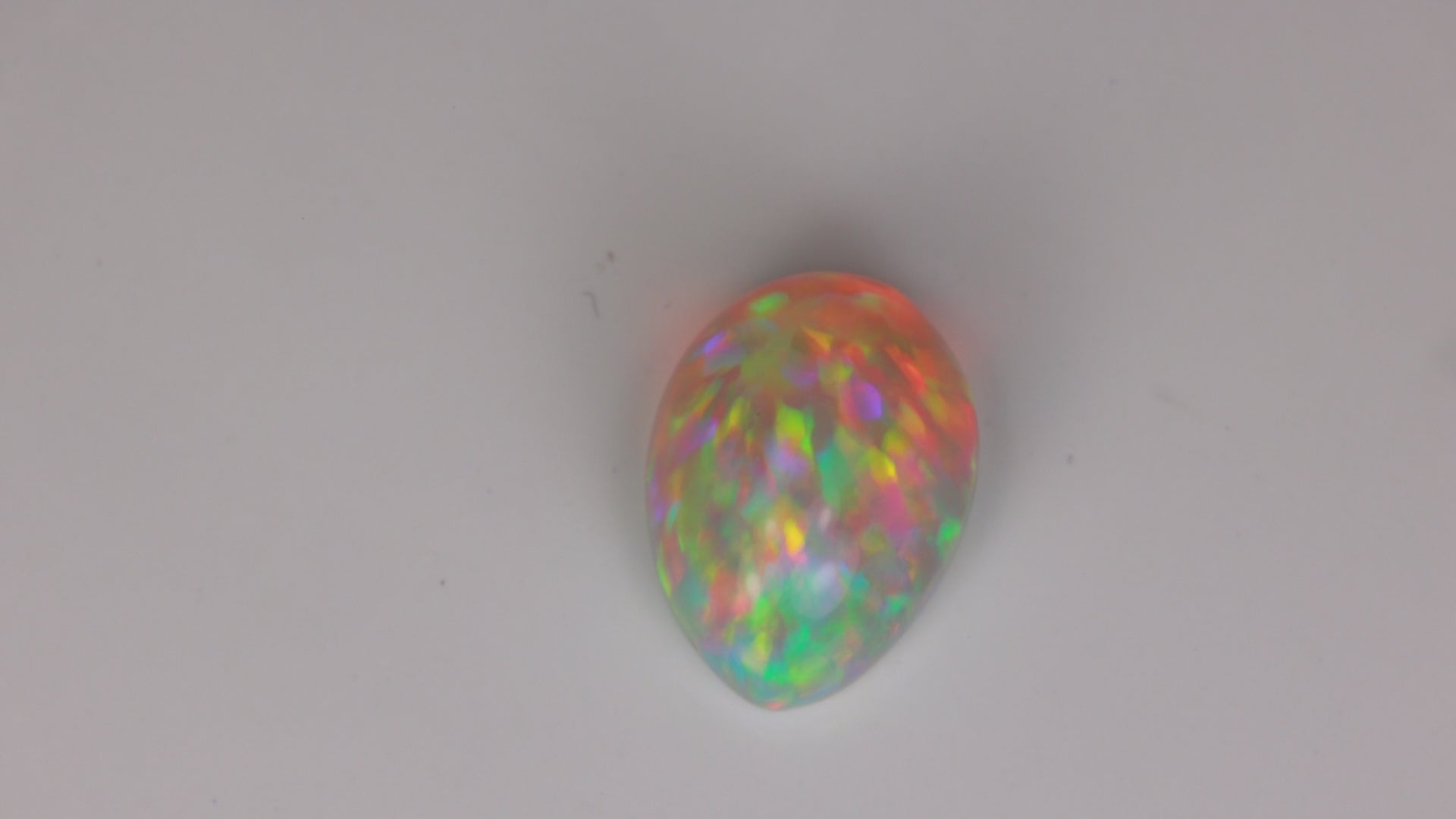 One 10.89 carats pear shape cabochon cut top crystal opal from Welo Ethiopia, cut grade very good, measuring 13.1 mm wide, 17.7 mm long, 9.2 mm deep; with very good polish and very good symmetry.  Hydrophane type opal, avoid chemicals, lotions and oils.
