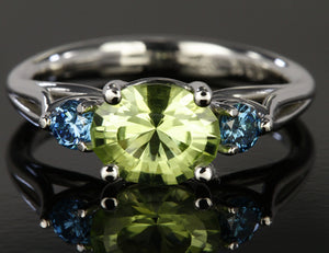 14K White Gold Oval Peridot and Enhanced Blue Diamond Ring
