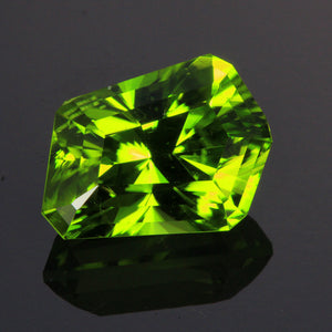 One 10.44 carats freeform peridot from Pakistan, green color,  minor inclusions, cut grade excellent, measuring 11 mm wide, 14.5 mm long, 9.2 mm deep; with excellent polish and excellent symmetry. The proportions of the peridot are as follows: total depth 83.6%, table width 43.6%.  Percentage yield 54.9%.  Pavillion angle 42 degrees,  Crown angle for step facets 50-40-30.  Barion style freeform cut by Steve Moriarty.  The rough weighed 19 carats.  Percentage yield 54.9%