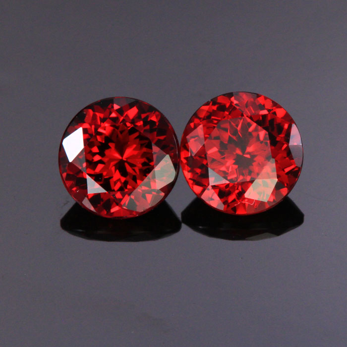 One pair 4.78 carats round brilliant cut garnets, red color, VS clarity, cut grade very good, measuring 8 mm wide, 8 mm long; with very good polish and very good symmetry.
