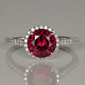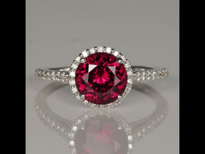 Ladies' 14k white gold rhodolite garnet ring, with one violet red color, GIA Type Il Clarity VS, round brilliant cut rhodolite garnet from Tanzania. The rhodolite garnet weighs 2.68 carats, measures 8.2 mm wide by 8.2 mm long, and is 4 prong set. In addition, there are prong set round brilliant cut diamonds, G-H color, SI2 clarity, with a total weight of .30 carat. The ring weighs 2.76 grams. Garnet has natural untreated color.