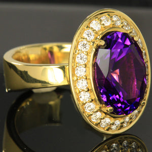 14k yellow gold ring designed by Christopher Michael, with one VIOLET color, GIA Type I Clarity VS, oval amethyst. The amethyst weighs 6.70 carats and is set in a 4 prong set. In addition, there are twenty-three pave' ideal round brilliant cut diamonds, F color, SI1 clarity, with a total weight of .68 carat. The ring weighs 17.00 grams. Our register #4am1063.