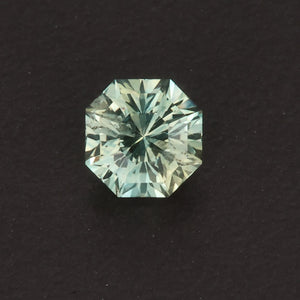 One 1.04 carats hexagonal mixed brilliant montana sapphire from Rock Creek, green color, SI2 (G.I.A. TYPE II) clarity, cut grade excellent, measuring 5.5 mm wide, 5.6 mm long, 4.1 mm deep; with excellent polish and excellent symmetry. The proportions of the montana sapphire are as follows: total depth 73.9%, table width 46.8%.  Sapphire is enhanced by heating.
