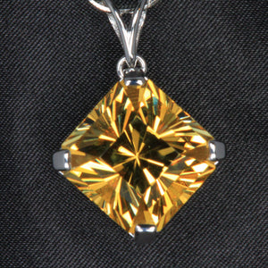 One 14 karat white gold pendant designed by Johny Vinay set with a 18.32 carats square barion scapolite, golden yellow color, FLAWLESS TO VVS clarity, cut grade excellent, measuring 15 mm wide, 15 mm long, 13 mm deep; with excellent polish and excellent symmetry. The proportions of the scapolite are as follows: total depth 86.6%, table width 43.3%. The scapolite also has a crown angle of 50° 40° 30° and a pavilion angle of 43°.  The overall quality rating of this scapolite is 952 out of 1000. Cut by Steve Moriarty.  The pendant weighs 8.14 grams.
