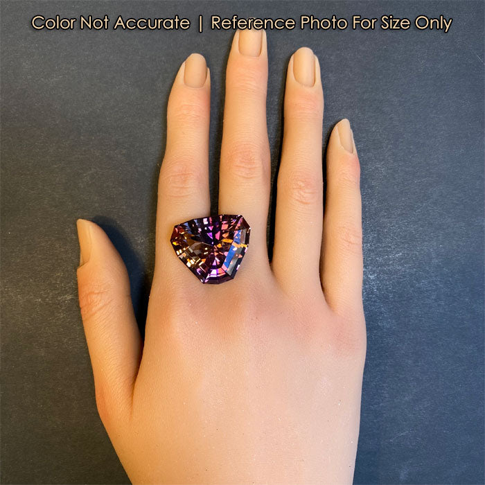One 44.12 carats shield ametrine from Bolivia, purple/golden yellow color, VS1 clarity, cut grade excellent, measuring 21.6 mm wide, 25 mm long, 16.5 mm deep; with excellent polish and excellent symmetry. Cut by Steve Moriarty. Natural untreated color.
