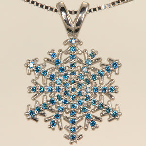 Christopher Michael designed 14 karat white gold snowflake pendant set with .50 carats of round enhanced blue diamonds. The diamonds have Si1-VS2 clarity. The pendant weighs 4.5 grams and measures on inch long.