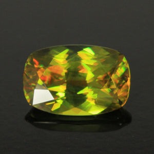 One 2.83 carats antique cushion sphene, brownish green color, 10X LOUPE CLEAN clarity, cut grade very good, measuring 7 mm wide, 10.5 mm long, 4.8 mm deep. From Madagascar.