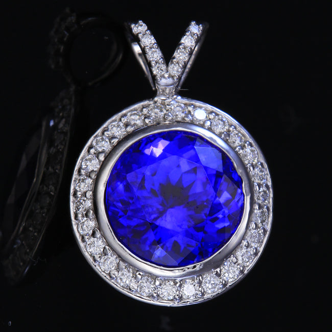 Platinum pendant made from customers ring with 14 karat diamond bale is set with a 3.06 carat tanzanite with blue violet exceptional color and Vs+ clarity. Accenting the center tanzanite are round diamonds with approximately g color and si1-vs2 clarity weighing approximately. 30 carats.