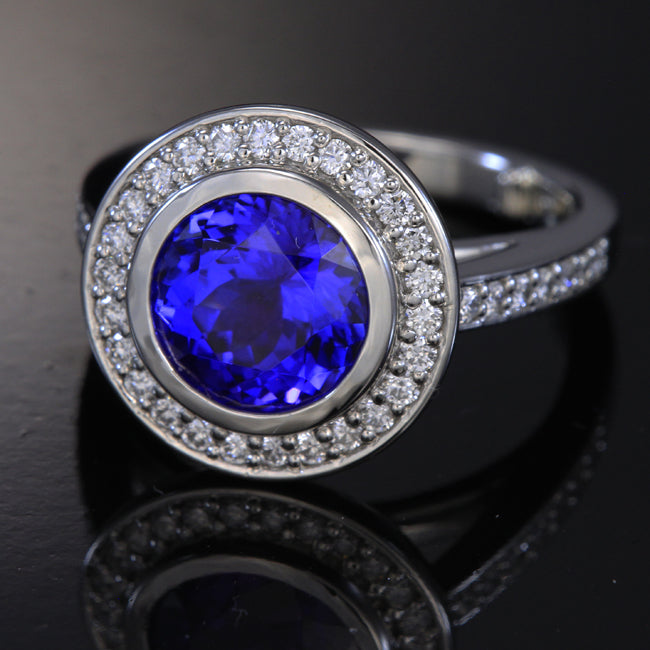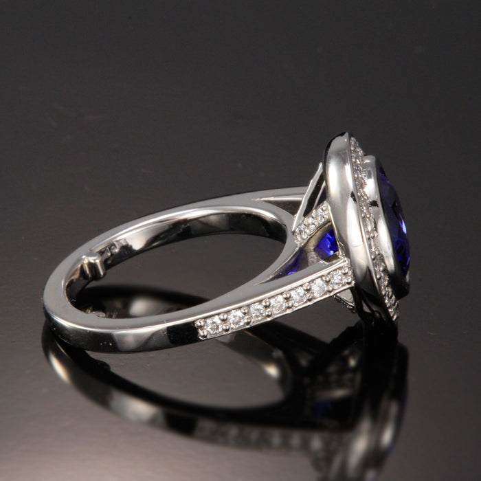10 grams of platinum in a custom designed ring by Christopher Michael set with approximately .50 carats of diamond with F-G color and Vs2-Si1 clarity. Bezeled center tanzanite weighs 3.07 carats with blue violet exceptional color and Vs+ clarity. Balls are added to shank.