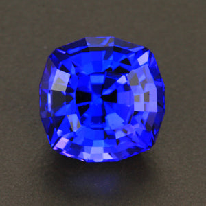 One 8.66 carats square cushion tanzanite, violet blue exceptional (10%/90%) color, VS1 clarity, cut grade excellent, measuring 11.3 mm wide, 11.4 mm long, 9.4 mm deep; with excellent polish and excellent symmetry. The proportions of the tanzanite are as follows: total depth 82.8%, table width 46.7%.  High quality cutting. Vivid sapphire blue color. The overall quality rating of this tanzanite is 983 out of 1000.  Tanzanite is color enhanced by heating. The Second photo and video shows the stone before heating.