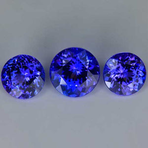 25% OFF w/ Coupon Code: RARE25 | Set of three round brilliant cut tanzanites weighing 5.25 carats total weight, blue violet vivid to blue violet exceptional color, VS1 clarity, cut grade very good; with good polish and very good symmetry. The larger tanzanite weighs 2.37 carats, measures 7.9 x 5.7 millimeters with blue violet exceptional (40%/60%) color, having a 947 out of 1000 overall quality rating. The two smaller tanzanites weigh 2.88 carats and measure 6.8 and 6.9 millimeters and have an average overall quality rating of 915 out of 1000 and have blue violet vivid (40%/60%) color. Tanzanites are color enhanced by heating.