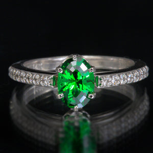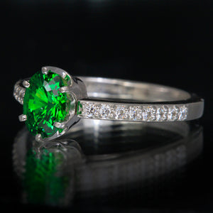 Top color tsavorite garnet with precision cutting giving this garnet from Tanzania outstanding brilliance. The tsavorite measures 8 x 6 millimeters which is as large as you can get for this weight and still be cut to ideal angles. Although this has Si2 clarity the inclusion is very difficult to locate among the brilliant flashes of this fine cut. The tsavorite garnet is accented by .27 carats of exceptional diamonds with D-E-F color and VS clarity. This ring weighs 5 grams in 14 karat white gold.
