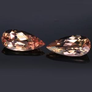 12.21 carats (total weight) pear-shape brilliant cut Morganites, peach color, FLAWLESS TO VVS clarity, cut grade very good, measuring 9 mm wide, 19 mm long; with very good polish and very good symmetry. Morganites are from Mozambique and are color enhanced by irradiation.