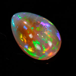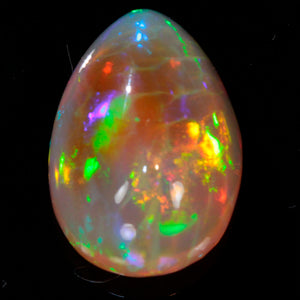 A unique opal with a slightly orange body color and various color patterns including honeycomb on one side with broad color flash throughout showing intense greens, blue and reds and flashes of the rest of the rainbow colors. An opal with real character. This Welo Ethiopian opal measures 22 x 16 x 10 millimeters. The opal is accented by a 1.08 carat tanzanite that is more blue than violet (vBV, violet blue vivid) measures 7.5 x 7.5 x 3.7 millimeters and has Vs clarity. Set in 14 karat white gold. Chain not included. Tanzanites are enhanced by heating. Ladies' 14k white gold opal pendant designed by Steve Moriarty, with one pear shape cabochon opal. The opal weighs 17.40 carats, measures 15.7 mm wide by 22 mm long by 10 mm deep, and is 4 prong set. In addition, there is one 3 prong set trilliant cut tanzanite, VIOLET BLUE VIVID color, VS clarity, measuring 7.5 mm wide by 7.5 mm long by 3.7 mm deep with a weight of 1.08 carats. The pendant weighs 6.13 grams. Opal is from Welo Ethiopia. Tanzanite is color enhanced by the typical heating.