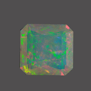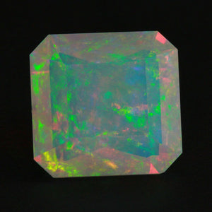 One 10.07 carats faceted emerald cut opal from Welo Ethiopia, cut grade excellent, measuring 15.5 mm wide, 16 mm long, 9.6 mm deep; with excellent polish and excellent symmetry. The proportions of the opal are as follows: total depth 61%, table width 58.6%. Cut by Steve Moriarty.