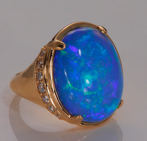 Exceptional Ethiopian Opal ring designed by Christopher Michael set with a large gem quality opal cut by Steve Moriarty. The opal measures 20 x 15 millimeters. Accenting the opal are .55 carats of high quality diamonds in 14 grams of 18 karat yellow gold. The base of the mounting is blackened to highlight the color of this highly transparent opal that is near flawless internally. Colors that rival the finest Australian opal.