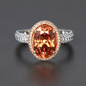 Ladies' platinum 18kt rose gold imperial zircon ring designed by Steve Moriarty, with one pink/orange color, VS1 clarity, oval imperial zircon from Tanga Tanzania. The imperial zircon weighs 5.96 carats, measures 8.4mm wide by 11.8 mm long by 6.2 mm deep, has very good cut, very good polish and very good symmetry, and is 4 prong set in 18k rose gold. In addition, there are 134 prong set ideal round brilliant cut diamonds, F color, SI1-VS2 clarity, with a total weight of .78 carat. The ring weighs 9.16 grams.