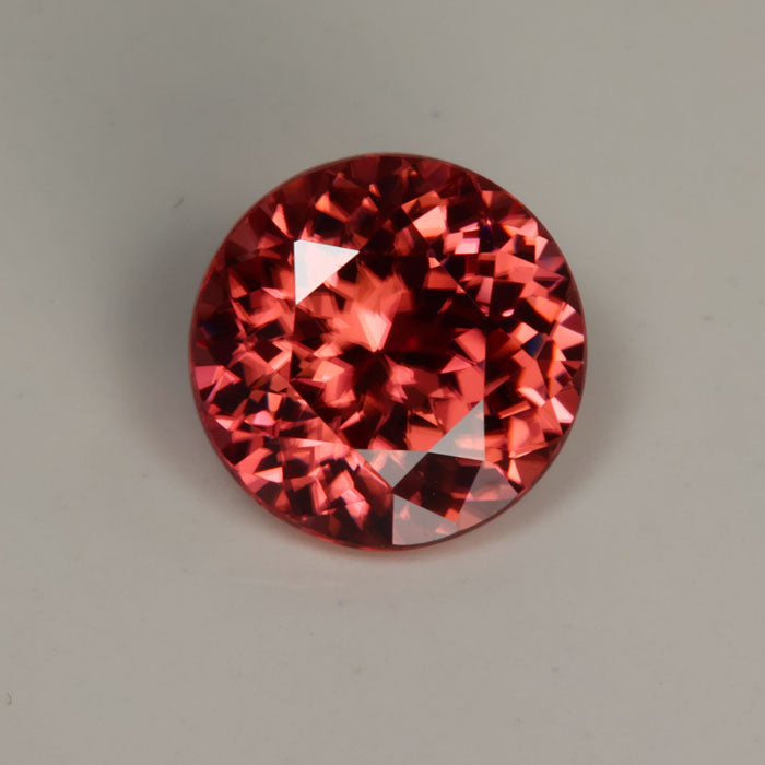 One 4.11 carats round mixed portuguese/round brilliant cut imperial zircon from Tanzania, peach color, VS1 clarity, cut grade excellent, measuring 9 mm wide, 9 mm long, 5.6 mm deep; with excellent polish and excellent symmetry. The proportions of the imperial zircon are as follows: total depth 62.2%, table width 48.9%. Zircon is color enhanced by heating.